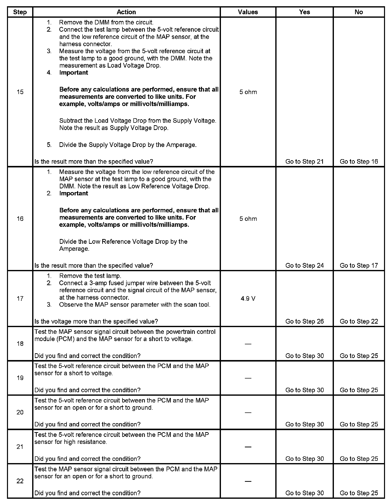 The manifold absolute pressure (MAP) sensor responds to changes in intake manifold pressure which gives an indication of the engine load. The MAP sensor has a 5-volt reference circuit, a low reference circuit, and a signal circuit. The powertrain control module (PCM) supplies 5 volts to the MAP sensor on the 5-volt reference circuit and provides a ground on the low reference circuit. The MAP sensor provides a signal to the PCM on the MAP sensor signal circuit, which is relative to the pressure changes in the manifold. With low MAP, such as during idle or deceleration, the PCM should detect a low MAP sensor signal voltage. With high MAP, such as ignition ON, engine OFF, or wide open throttle (WOT), the PCM should detect a high MAP sensor signal voltage. The MAP sensor is also used in order to calculate the barometric pressure (BARO) when the ignition switch is turned ON, with the engine OFF. The BARO reading may also be updated whenever the engine is operated at WOT. The PCM monitors the MAP sensor signal for voltage outside of the normal range. If the PCM detects a MAP sensor signal voltage that is excessively low, DTC P0107 sets. If the PCM detects a MAP sensor signal voltage that is excessively high, DTC P0108 sets.