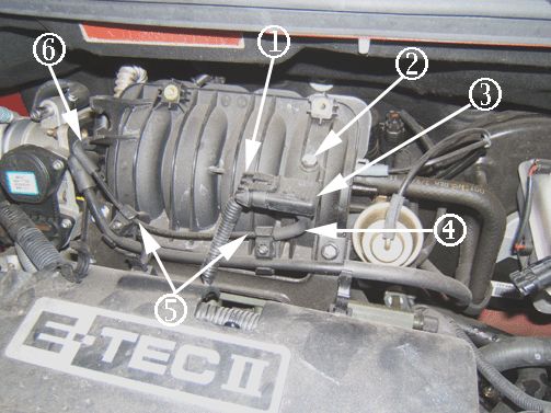 2. Install the intake manifold vacuum hole plug on the remaining open intake manifold port (6) as shown above.