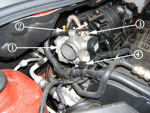1. Remove the clamp from the air outlet duct assembly at the throttle body (2).