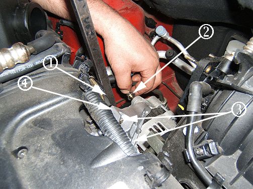 3. Remove the two nuts/washers holding the generator shackle bracket to the engine (4).