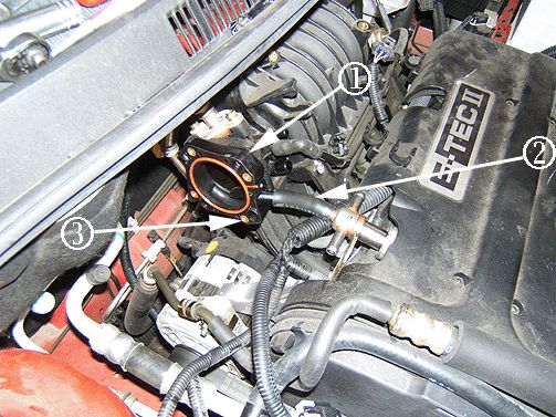 2. Disconnect the coolant hoses from the throttle body assembly (2).