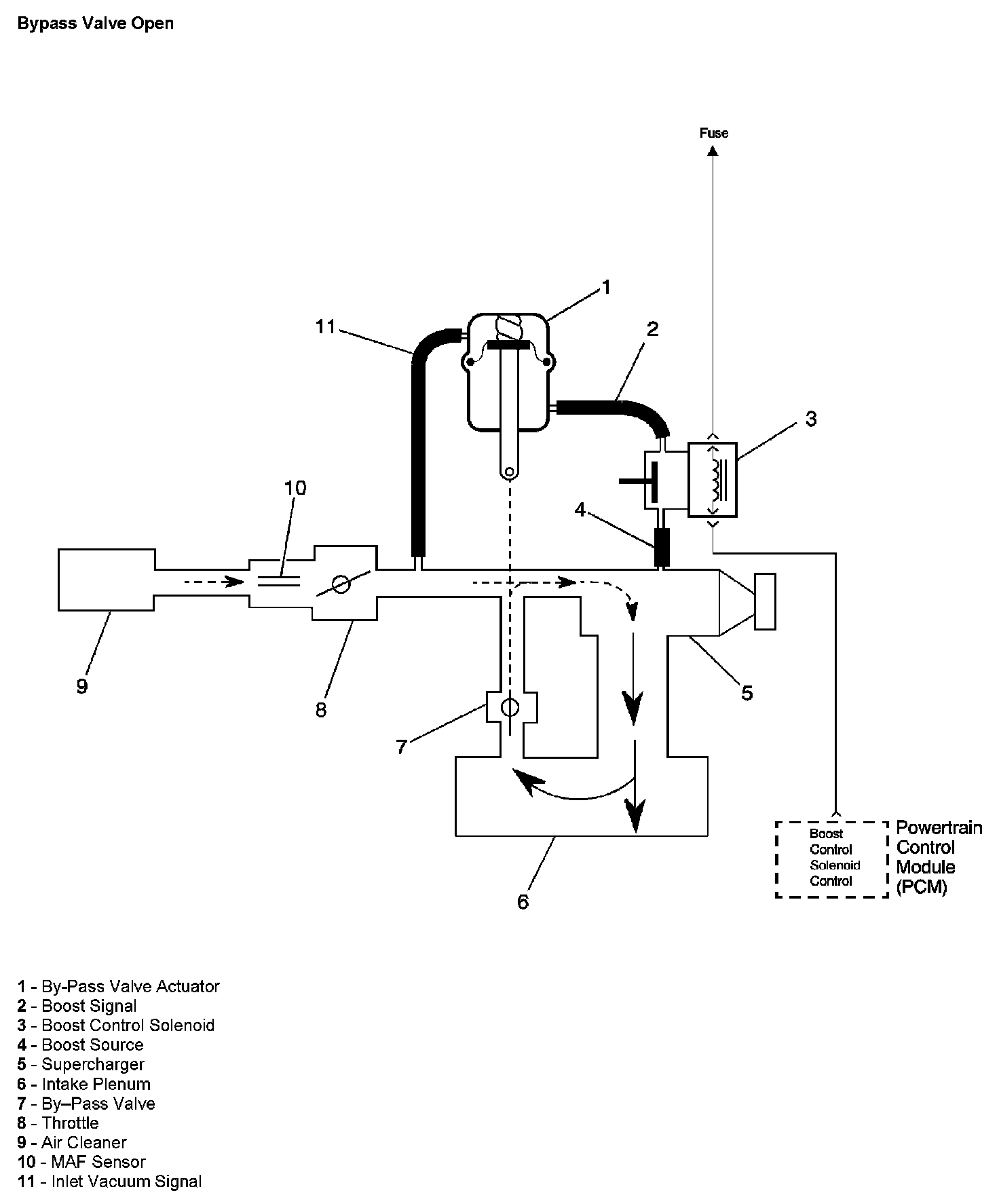 The PCM controls boost pressure by using the boost control solenoid. The boost control solenoid is normally an open valve. Under most conditions, the PCM commands the boost control solenoid to operate at a 99-100 percent duty cycle. This keeps the solenoid valve closed and allows only inlet vacuum to control the position of the bypass valve. At idle, engine vacuum is applied to the upper side of the bypass valve actuator, counteracting spring tension to hold the bypass valve open. As engine load is increased, engine vacuum is decreased, causing the spring in the bypass valve actuator to overcome the applied vacuum, closing the bypass valve and allowing the boost pressure to increase. The bypass valve starts to close when the vacuum measures 250 mm Hg (10 in Hg) and is fully closed at 90 mm Hg (3.5 in Hg). When reduced boost pressure is desired, the PCM commands the boost control solenoid to operate at a 0 percent duty cycle. This opens the solenoid valve and allows boost pressure to enter the bypass valve actuator at the lower side to counteract the spring tension, opening the bypass valve and recirculating excess boost pressure back into the supercharger inlet.