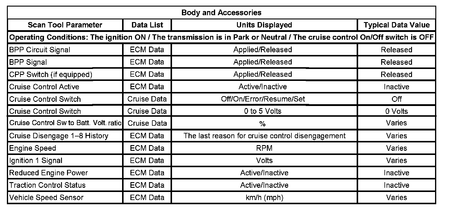 The scan tool data lists contain all of the cruise control related parameters that are available on the scan tool. The parameters in the list are arranged in alphabetical order. The data list column indicates the location of the parameter within the scan tool menu selections.