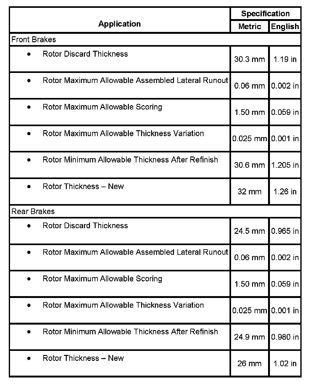 Disc Brake Component Specifications: