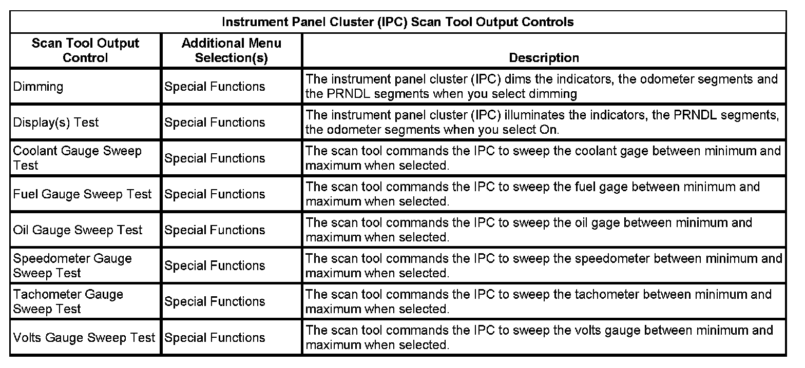 Instrument Panel Cluster (IPC) Scan Tool Output Controls