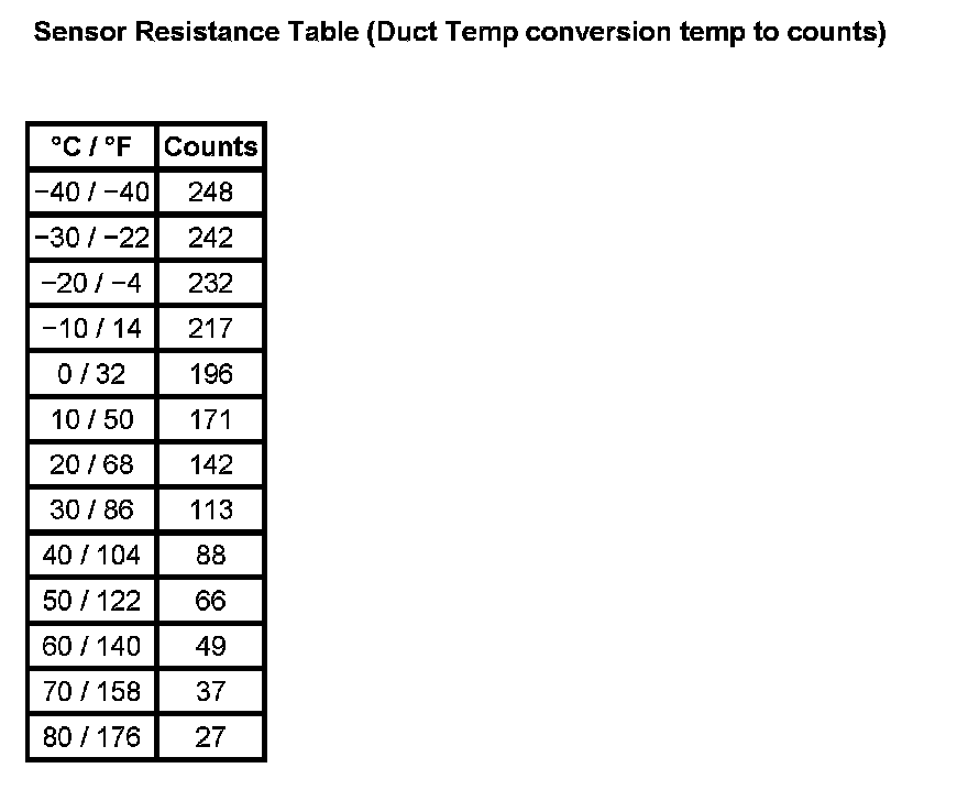 Sensor Resistance Table (Duct Temp Conversion Temp To Counts):