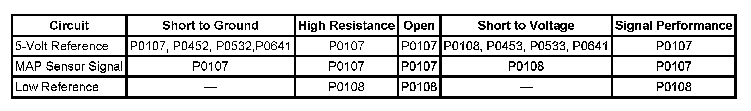 The control module supplies 5 volts to the MAP sensor on the 5-volt reference circuit. The control module also provides a ground on the low reference circuit. The MAP sensor provides a signal to the control module on the MAP sensor signal circuit which is relative to the pressure changes in the manifold. The control module should detect a low signal voltage at a low MAP, such as during an idle or a deceleration. The control module should detect a high signal voltage at a high MAP, such as the ignition is ON, with the engine OFF, or at a wide open throttle (WOT). The MAP sensor is also used in order to determine the barometric pressure (BARO). This occurs when the ignition switch is turned ON, with the engine OFF. The BARO reading may also be updated whenever the engine is operated at WOT. The control module monitors the MAP sensor signal for voltage outside of the normal range.