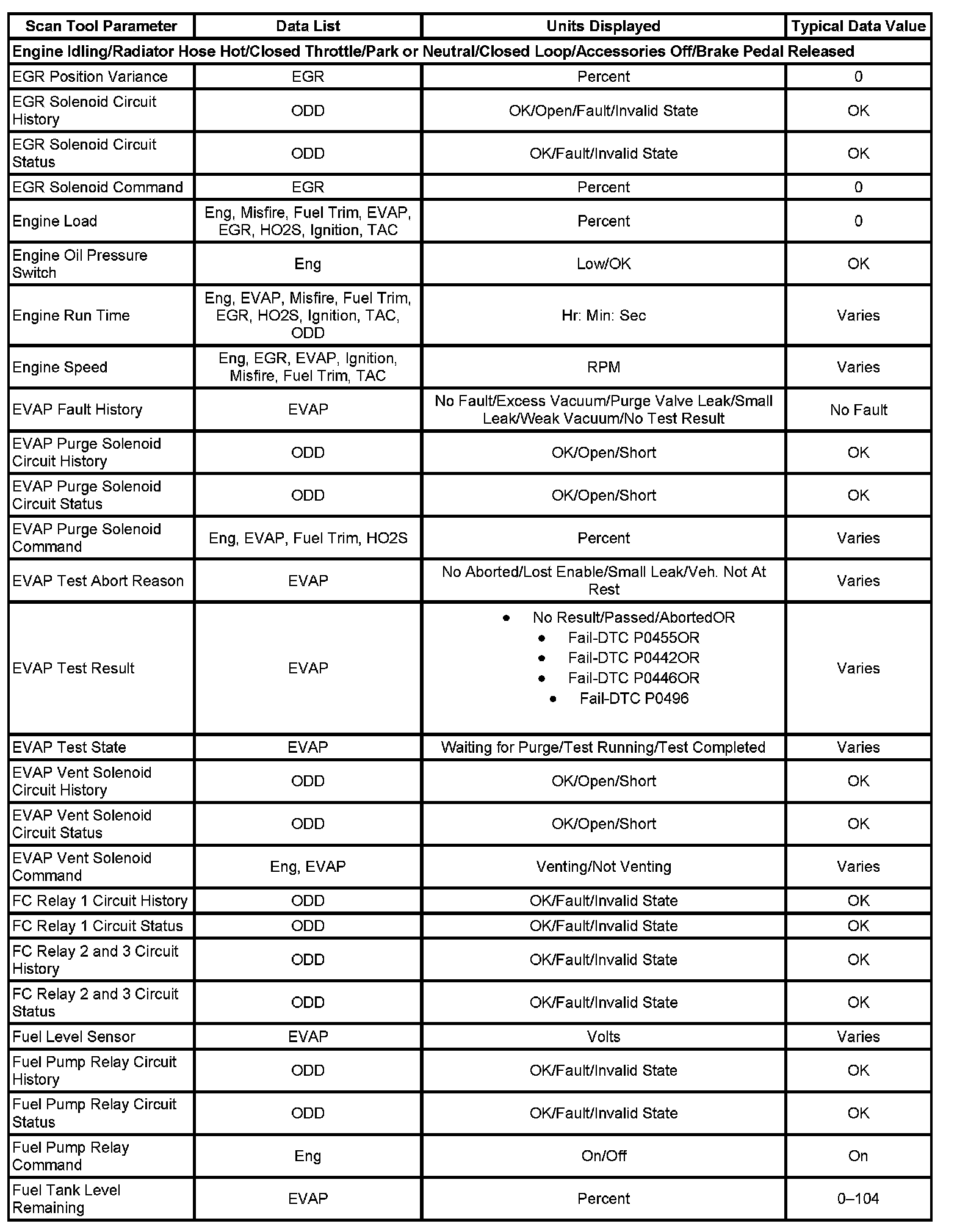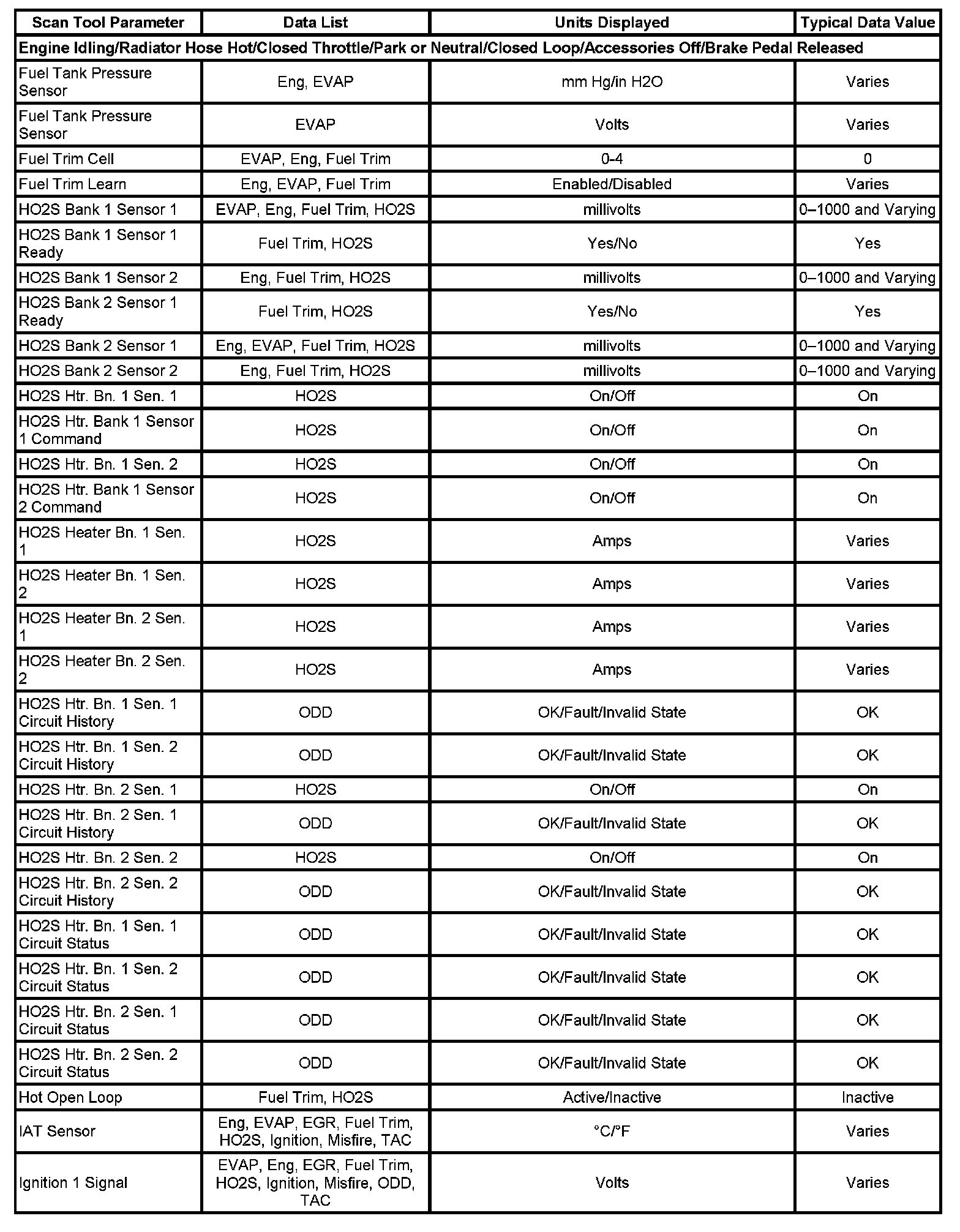 The Engine Scan Tool Data List contains all engine-related parameters that are available on the scan tool. The list is arranged in alphabetical order. A given parameter may appear in any one of the data lists, and in some cases may appear more than once, or in more than one data list in order to group certain related parameters together.