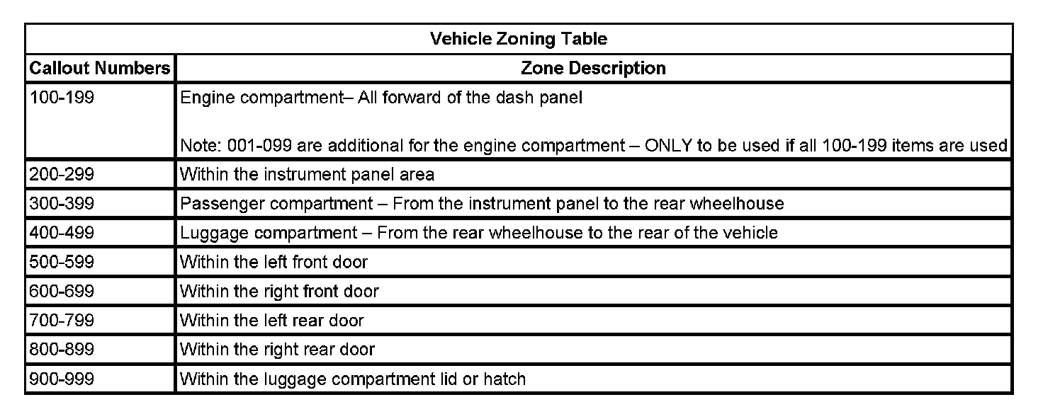 All grounds, in-line connectors, pass-through grommets, and splices have identifying numbers that correspond to where they are located in the vehicle. The following table explains the numbering system.