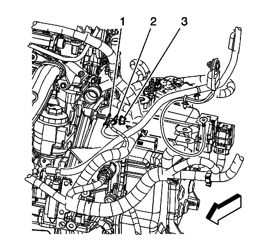 3. Install the engine wiring harness terminal (2) to the transaxle stud.