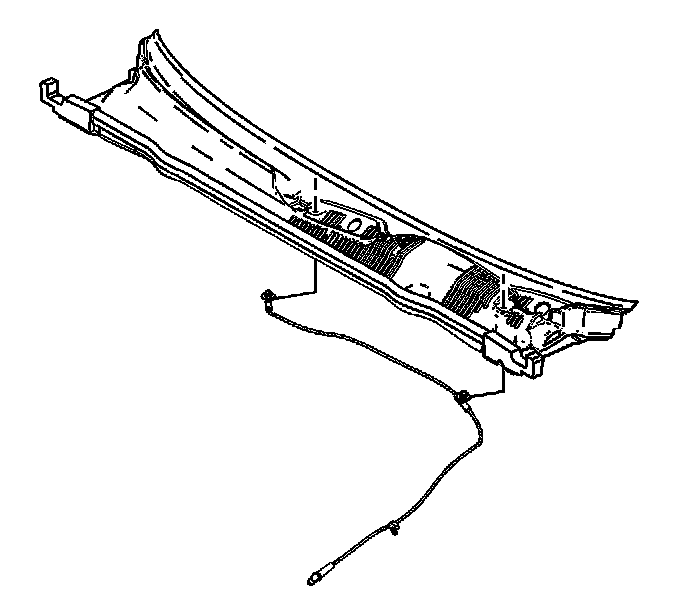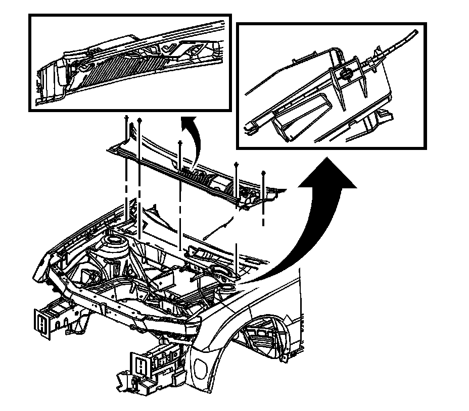 2. Position the air inlet grille panel to the vehicle. Ensure that the lace molding is laying properly on the lower edge of the windshield.