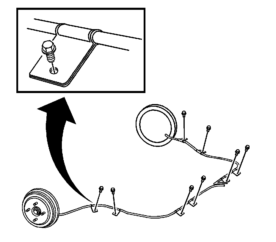 5. Install the parking brake cable to the underbody side brackets on each side of the vehicle, and a bracket near the underbody side bracket.