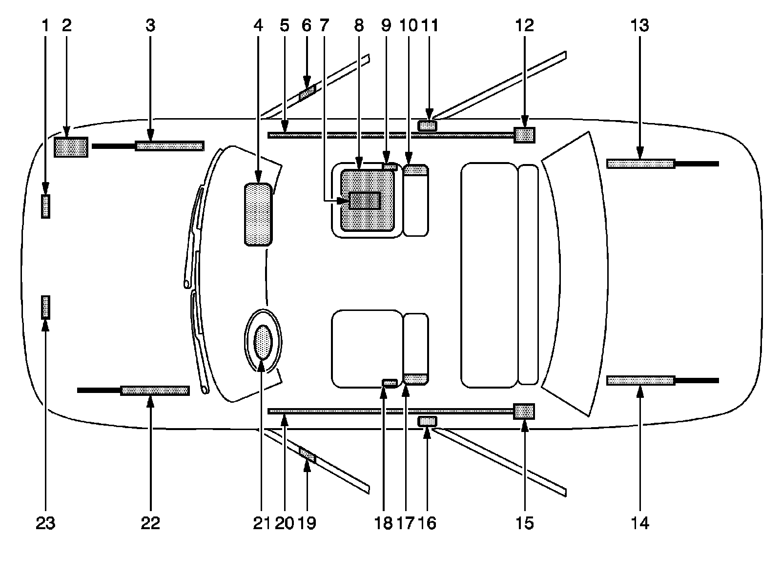 20. Left Roof Rail Air Bag--Located under the headliner, extending from the driver front windshield pillar to the driver rear windshield pillar