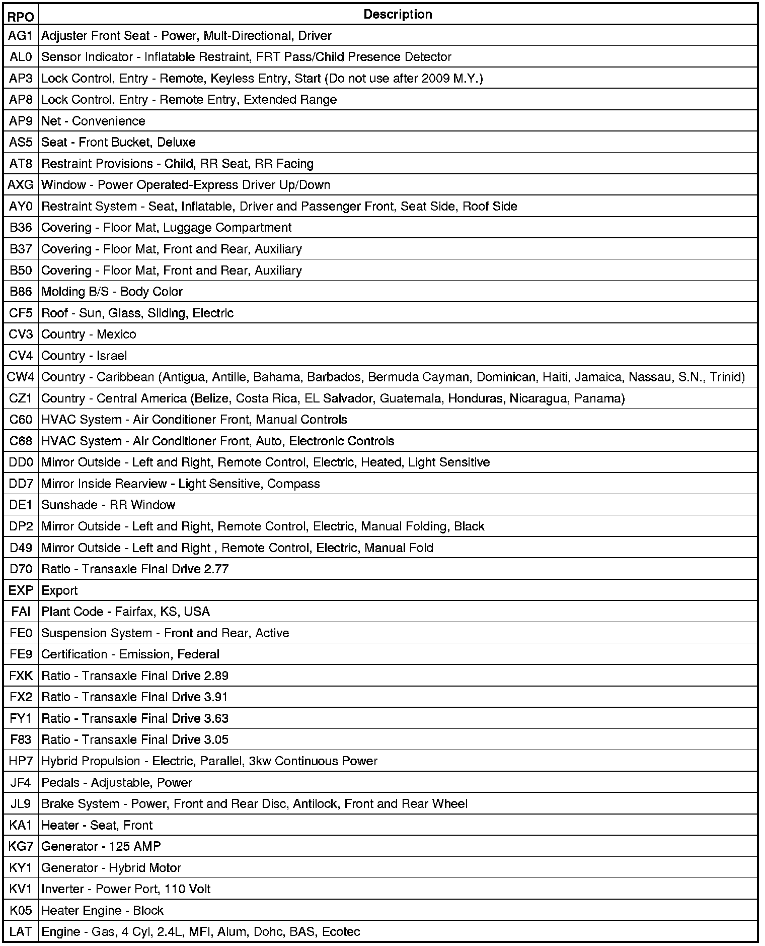 The following table provides the description of the Regular Production Option (RPO) codes that are available on the vehicle. The vehicle's RPO list is printed on the Service Parts Identification Label.