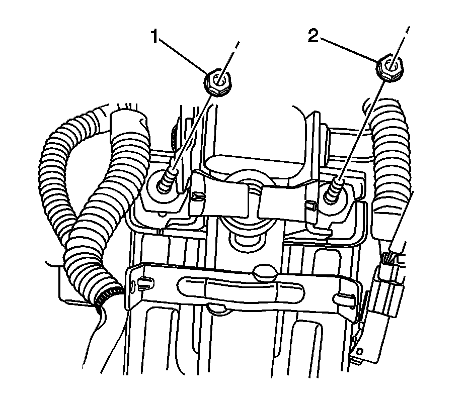 15. Remove the nuts (1, 2) holding the steering column jacket assembly upper bracket.