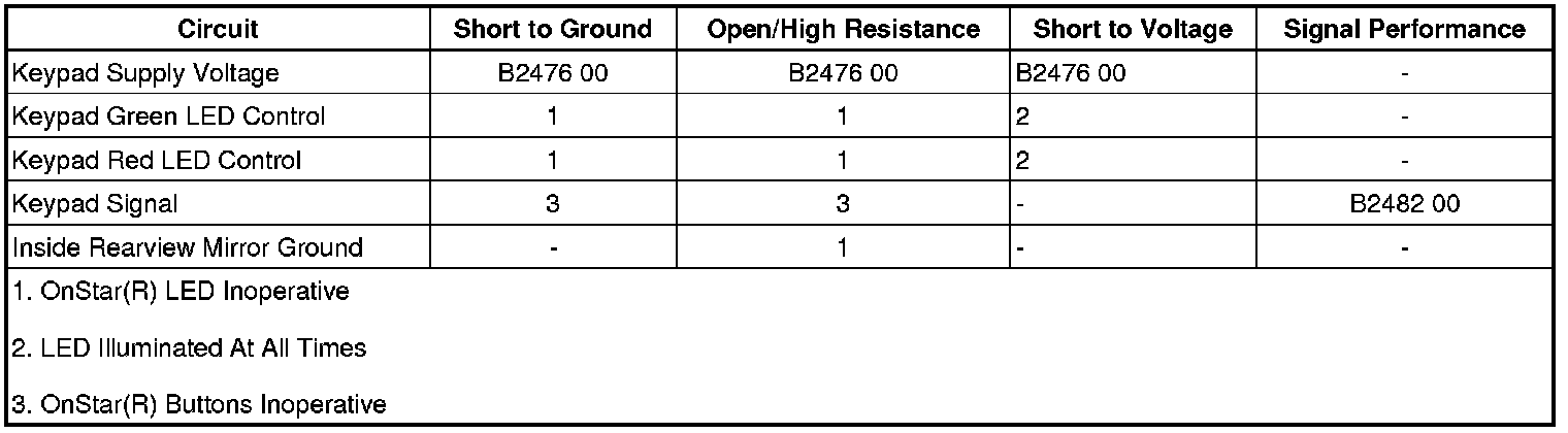 The OnStar(R) button assembly consists of 3 buttons, Call/Answer, OnStar(R) Call Center, and OnStar(R) Emergency. The telematics communication interface control module supplies the OnStar(R) button assembly with 10 V via the keypad supply voltage circuit. Each of the buttons, when pressed, completes the circuit across a resistor allowing a specific voltage to be returned to the telematics communication interface control module over the keypad signal circuit. Depending upon the voltage range returned, the telematics communication interface control module is able to identify which button has been activated.