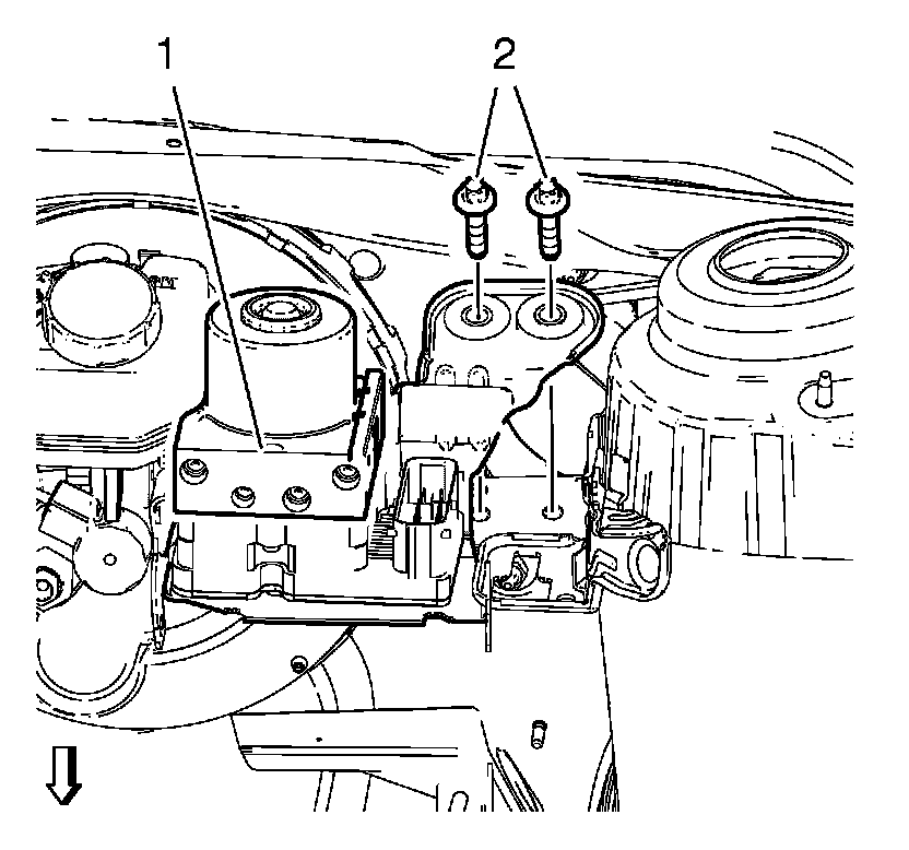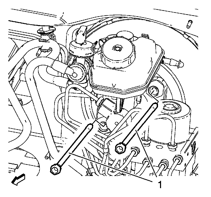7. Pull the brake booster and the BPMV assembly forward in order to get access to the brake pedal bracket nuts (1).