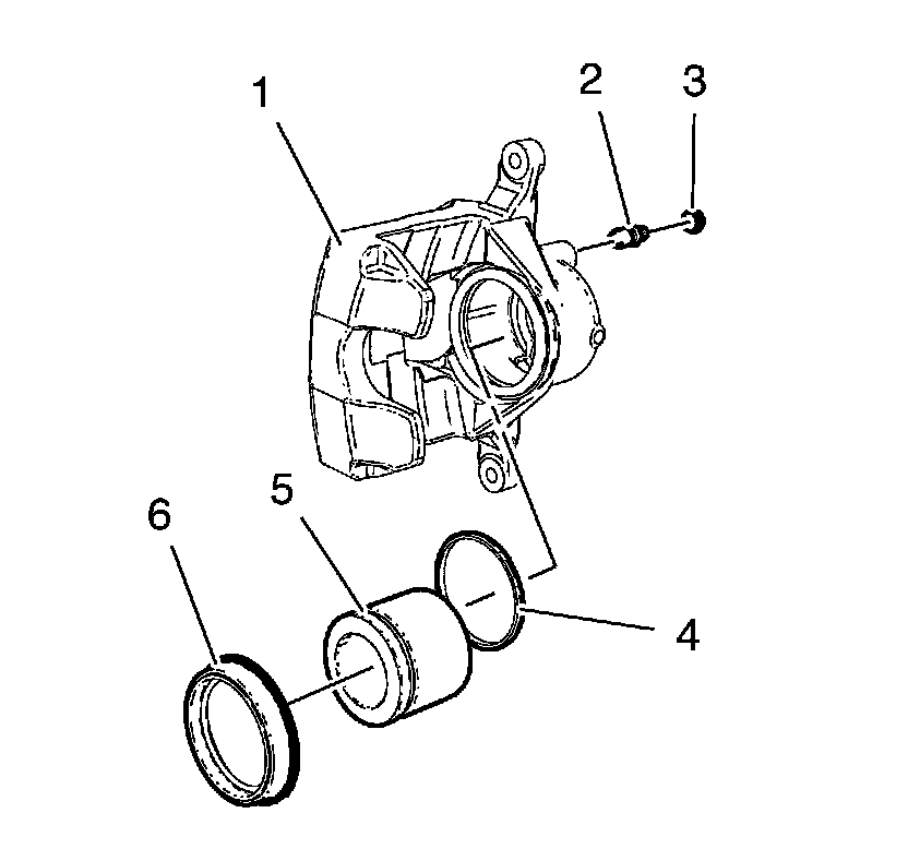 2. Inspect the caliper piston dust boot seal (6) for cracks, tears, cuts, deterioration and/or improper seating in the caliper body. If any of these conditions are present, the brake caliper requires overhaul or replacement.