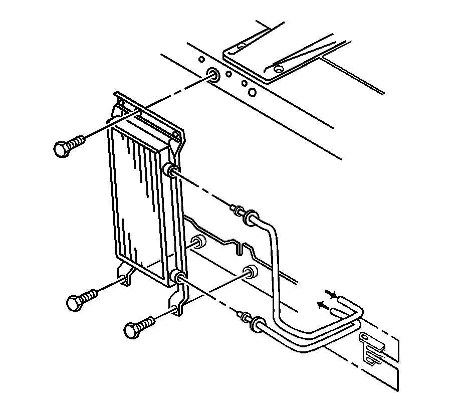 1. Install the inlet and outlet auxiliary transaxle oil cooler hoses to the auxiliary transaxle oil cooler. Refer to Transmission Fluid Cooler Hose/Pipe Quick-Connect Fitting Disconnection and Connection (Transmission Fluid Cooler Hose/Pipe Quick-Connect Fitting Disconnection and Connection).