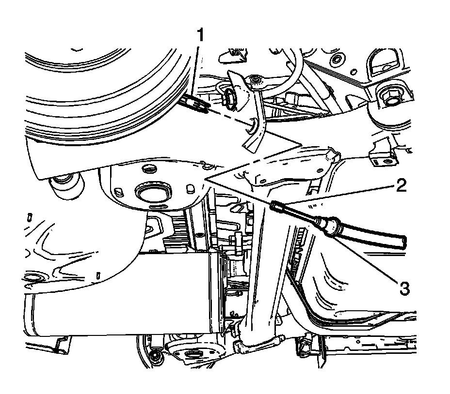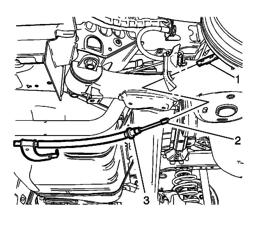 13. Release the left parking brake cable retainer (3) from the rear axle bracket.