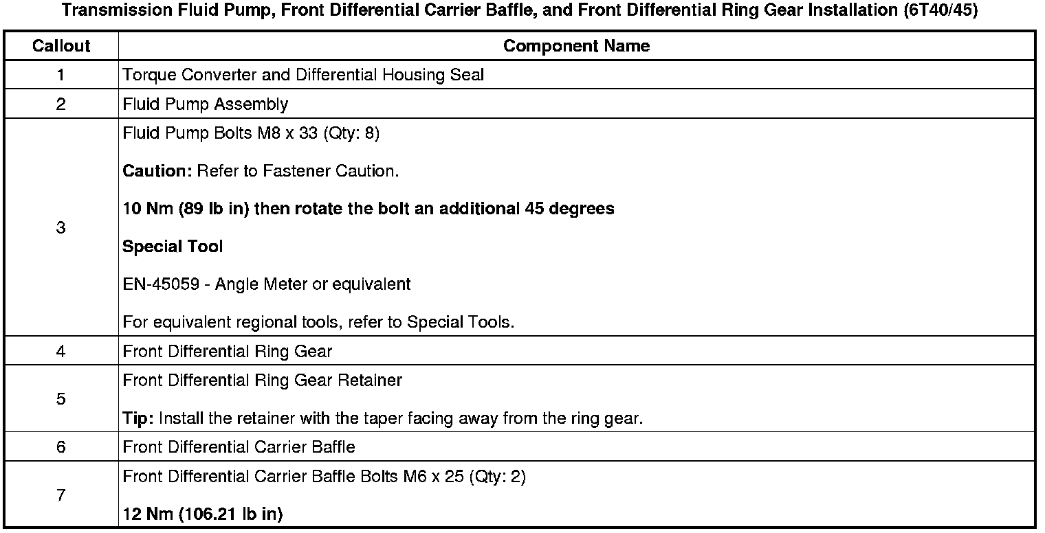 40. Transmission Fluid Pump, Front Differential Carrier Baffle, and Front Differential Ring Gear Installation (6T40/45)