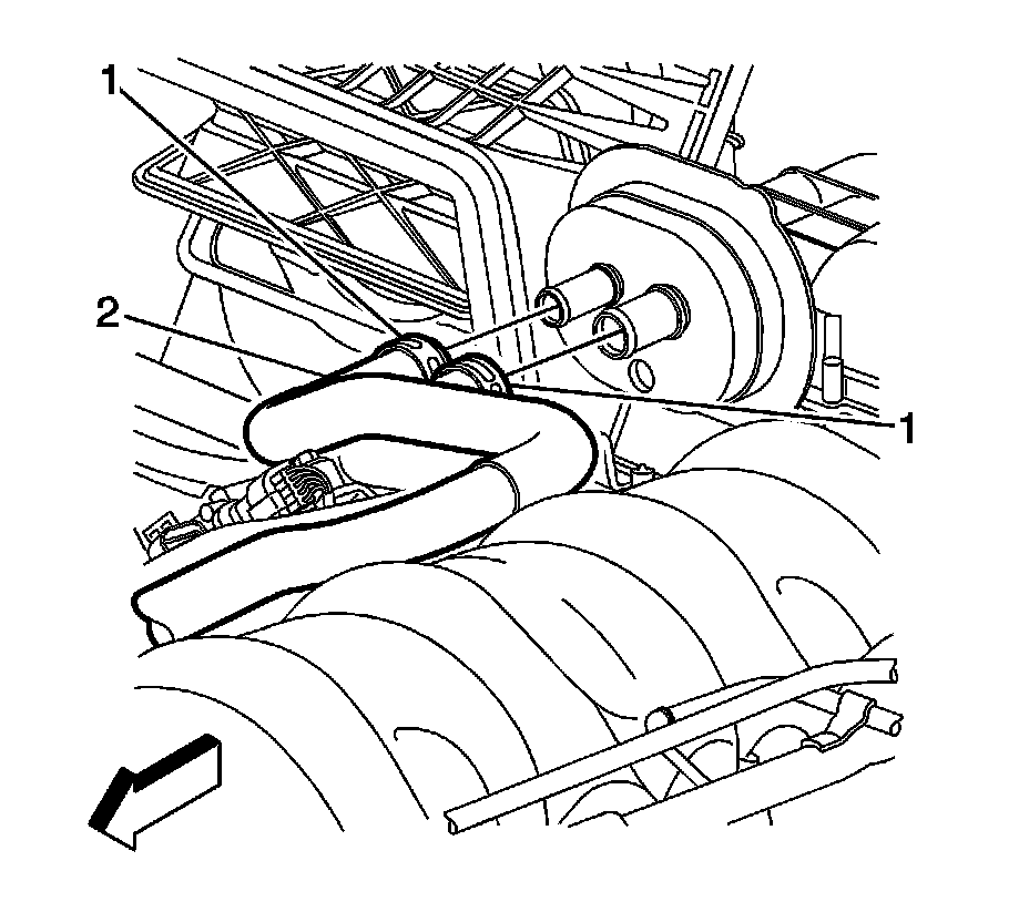 18. Remove the heater inlet rear and outlet hose (2) from the heater core.