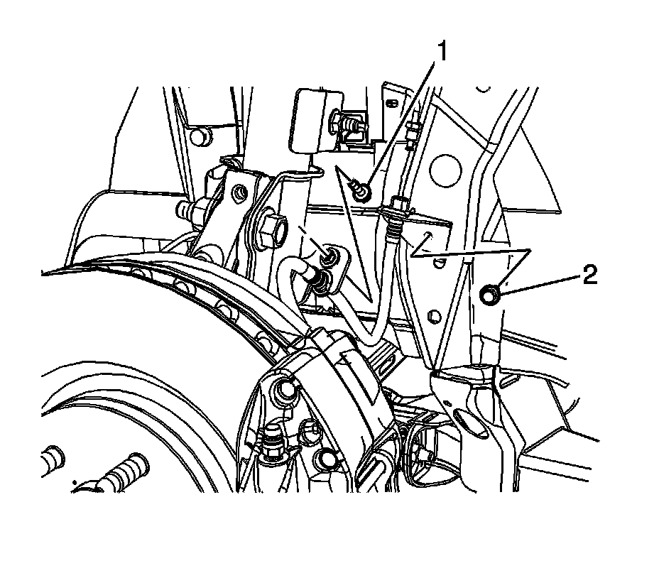 14. Install the brake hose bracket bolt (2) to the wheelhouse panel and tighten to 9 Nm (80 lb in).