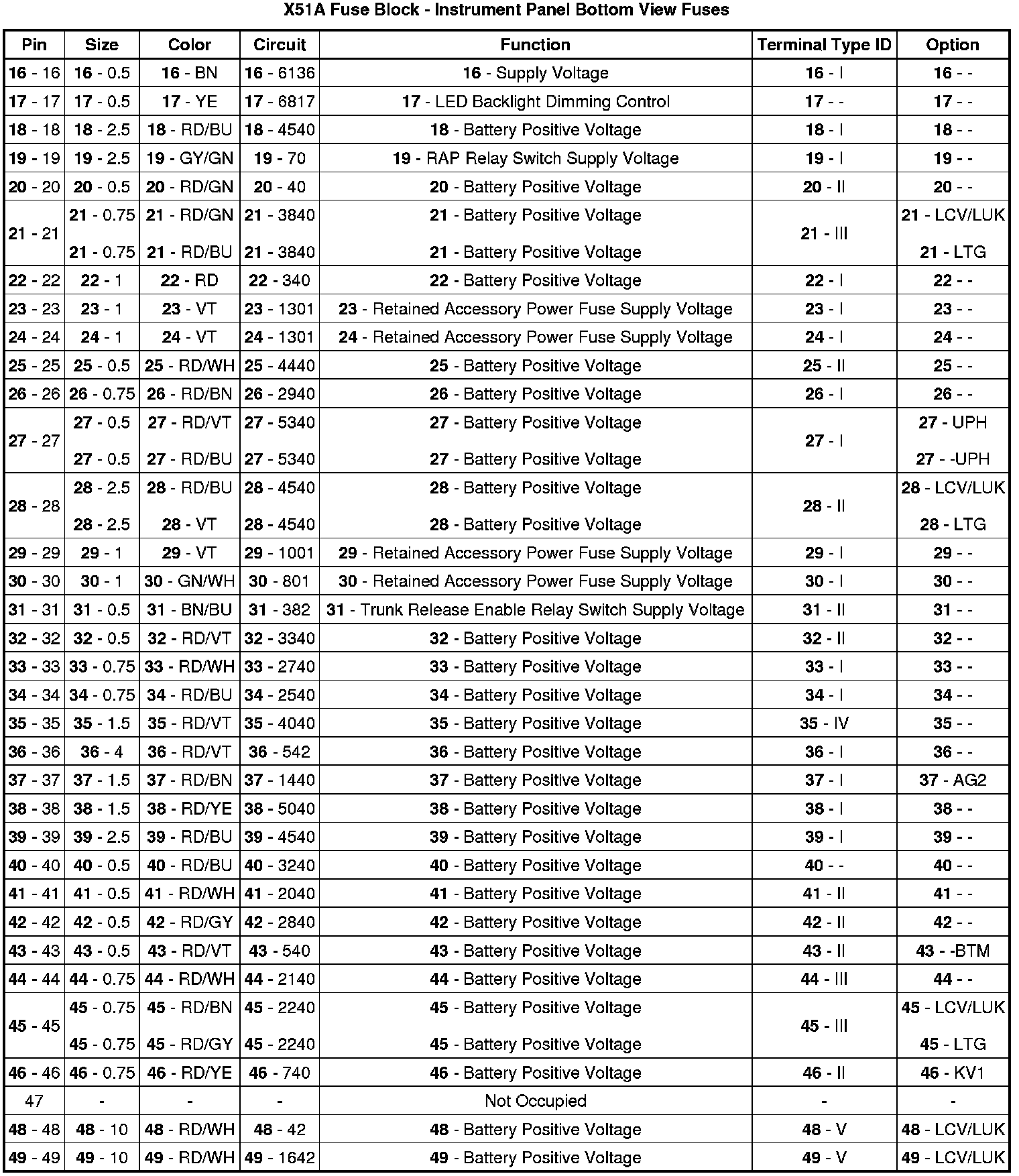 X51A Fuse Block - Instrument Panel Bottom View Fuses
