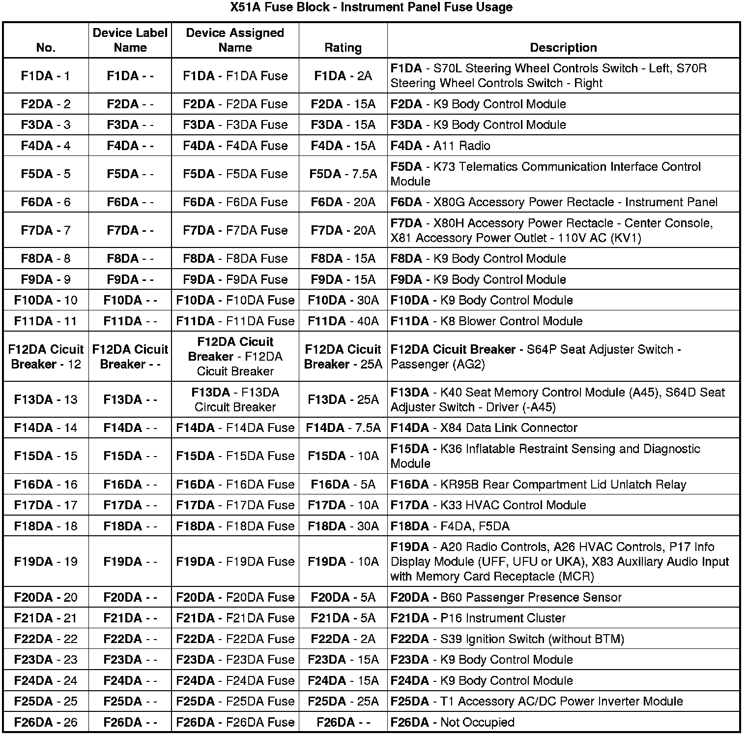 X51A Fuse Block - Instrument Panel Top View Fuses