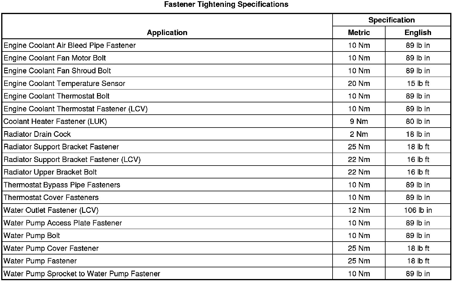 Fastener Tightening Specifications