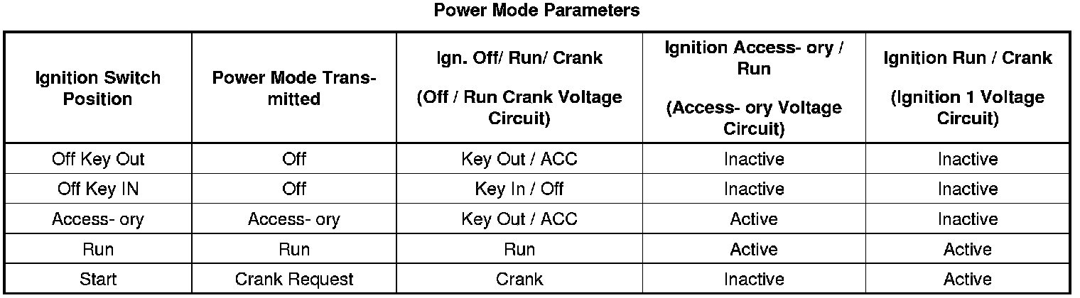 The power mode master receives ignition switch signals to identify the operators desired power mode. The Power Mode Parameters table below illustrates the correct state of these input parameters (circuits) in correspondence to the ignition switch position:
