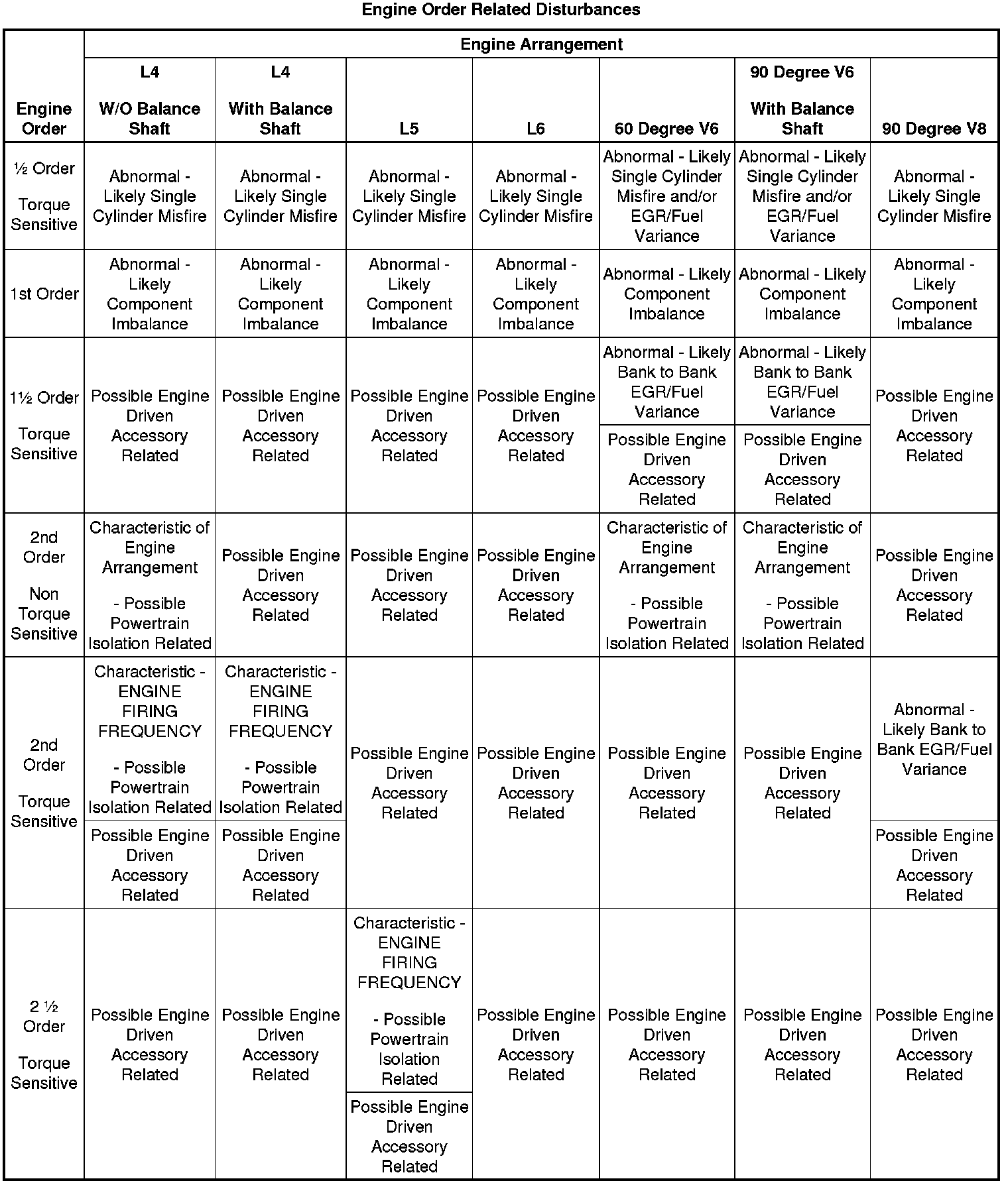 3. If the dominant frequency in Hz, recorded during duplication of the disturbance and the engine firing frequency in Hz, just calculated ARE related, then an engine FIRING FREQUENCY related disturbance is present. Engine firing frequency disturbances are usually related to improper isolation of a component. Refer to the Engine Order Related Disturbances table.