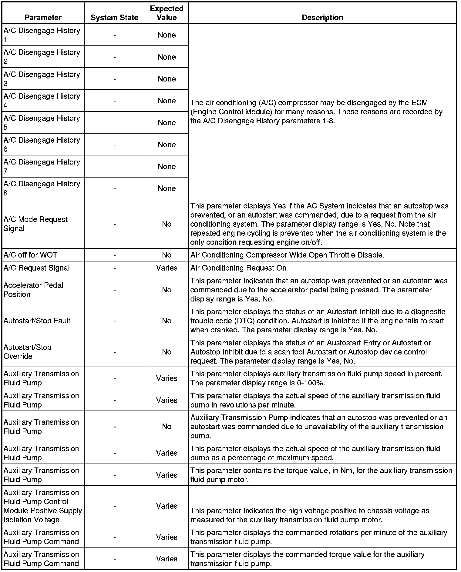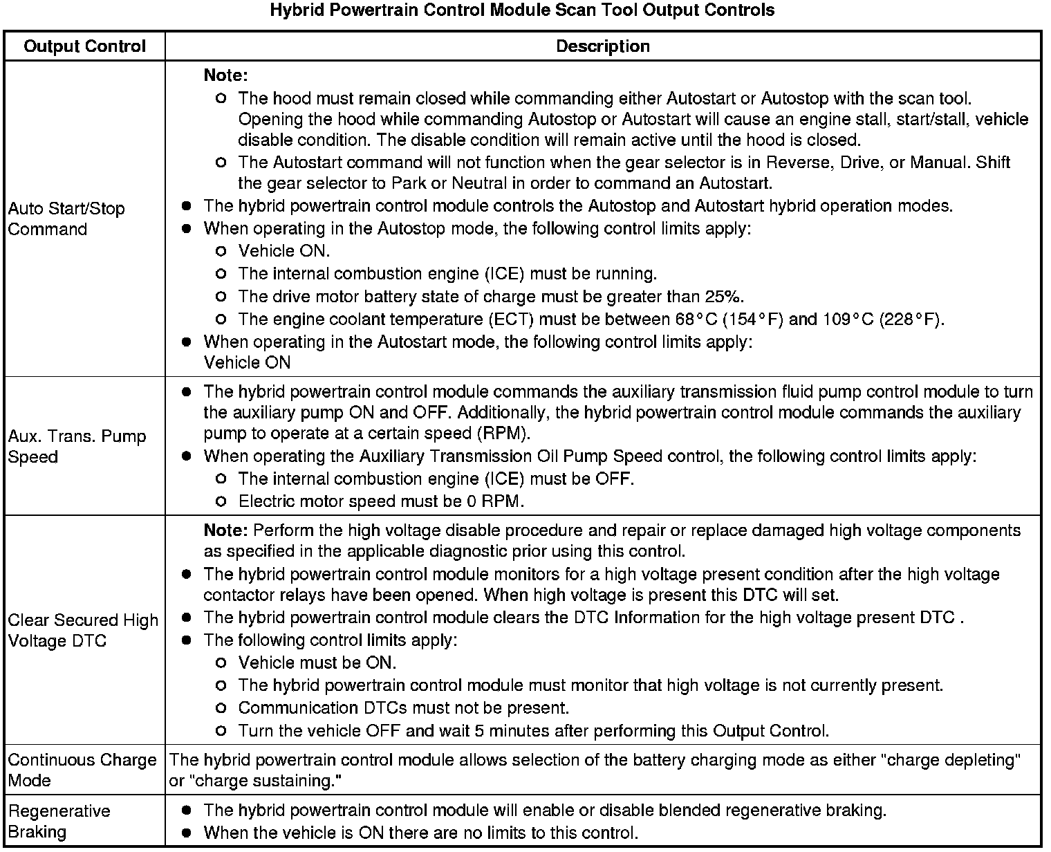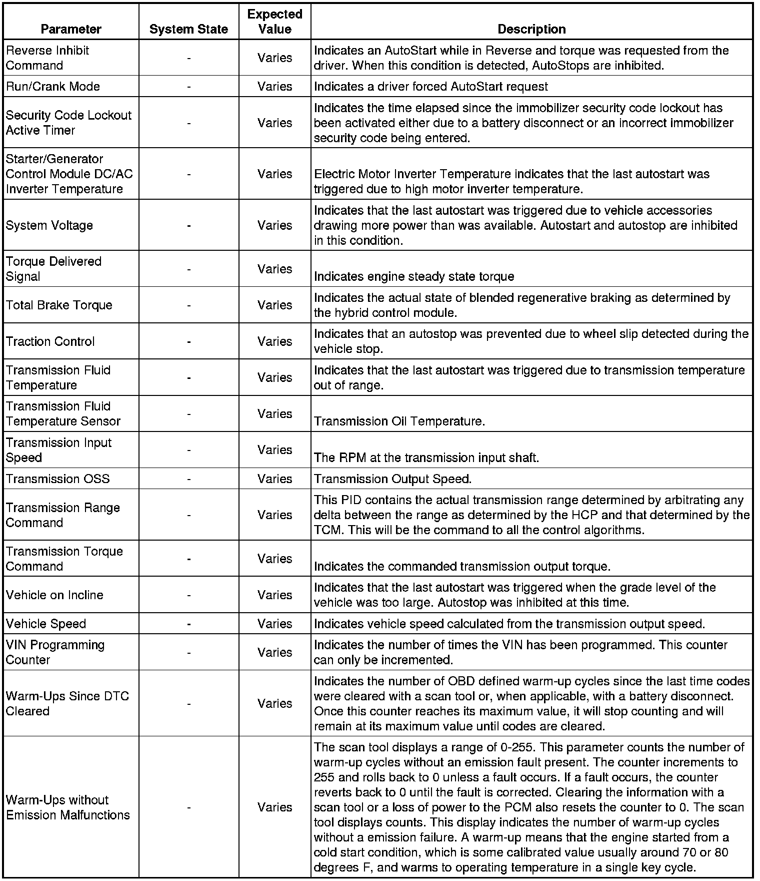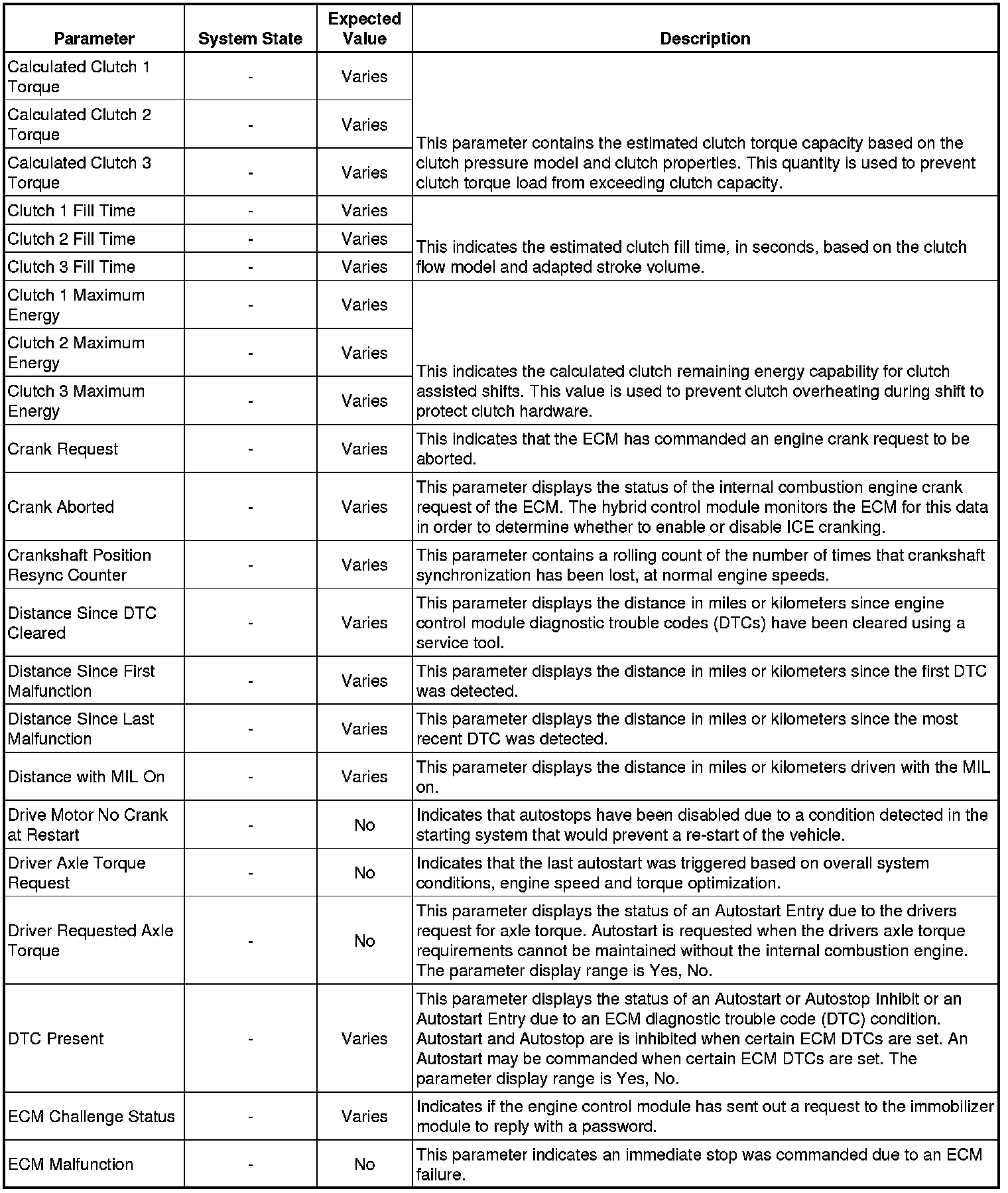 The scan tool values from a properly running vehicle may be used for comparison with the vehicle you are diagnosing. The Hybrid Powertrain Control Module Scan Tool Data Parameters list represents values that would be seen on a normally running vehicle.