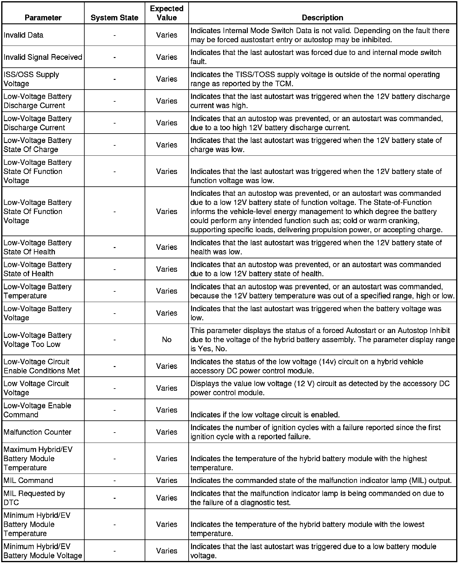 Only the parameters listed below are referenced in this service manual for use in diagnosis. If all values are within the typical range described below, refer to Symptoms - Hybrid Controls Symptoms - Hybrid Controls for diagnosis.