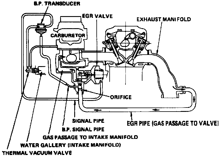 This system, Figs. 14, 15, 16 and 16A, is used to reduce oxides of nitrogen emissions by lowering the peak combustion temperature in the engine. This is accomplished by introducing a metered amount of exhaust gases into the intake manifold at throttle positions other than idle.