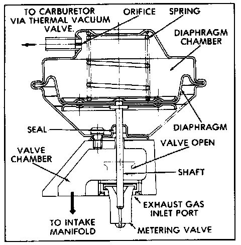 When exhaust back-pressure is too low to overcome diaphragm spring tension, the vacuum signal is vented to atmosphere and does not pass through to the EGR valve. With no vacuum signal applied to the EGR valve, exhaust gas does not recirculate.