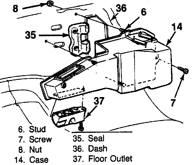 7. Screw that holds the defroster duct to the heater distributor.