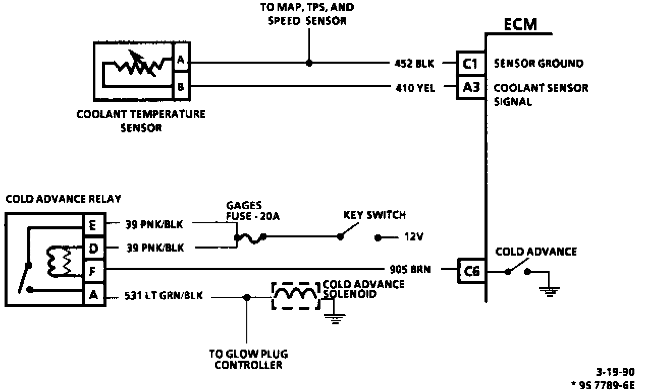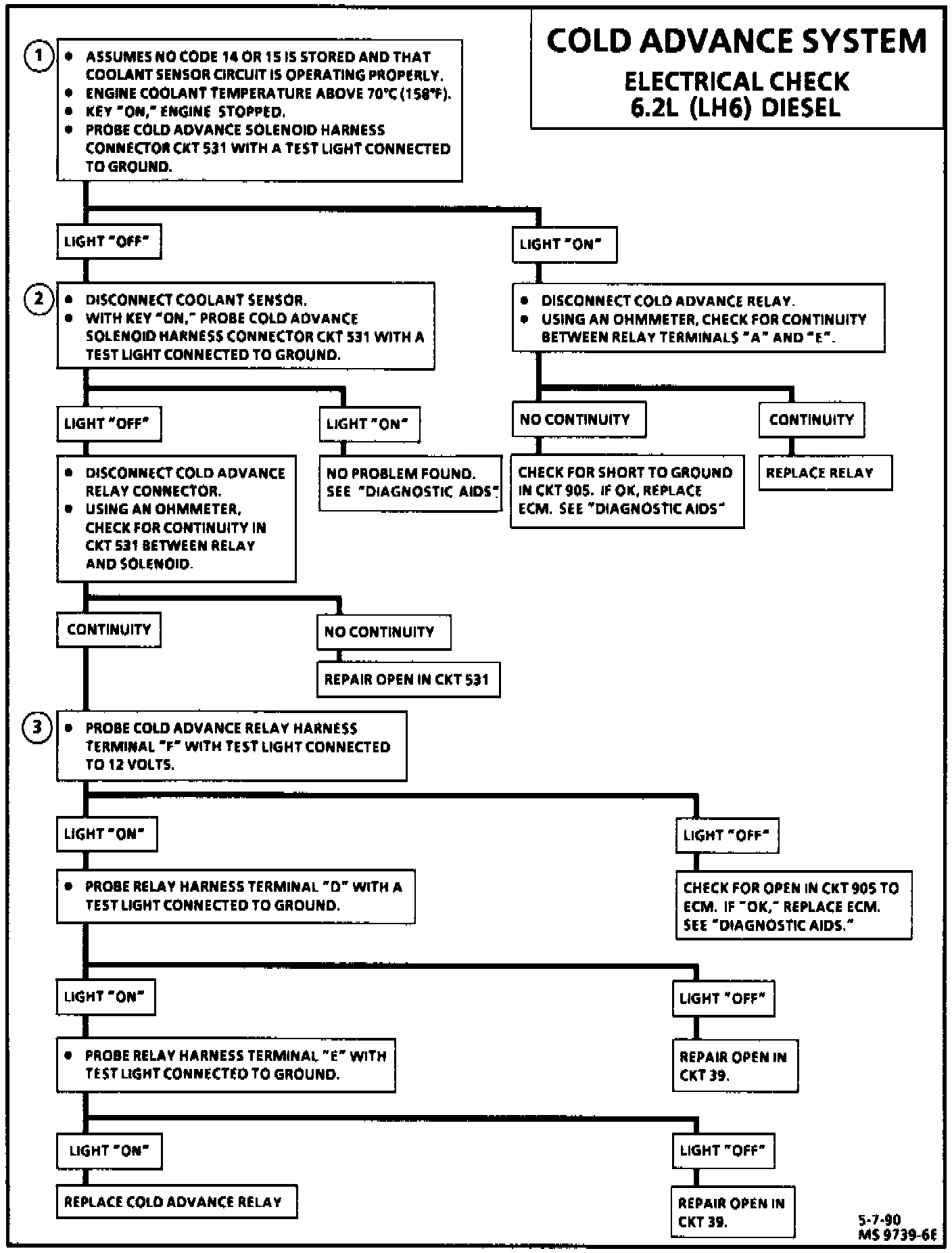 With the key "ON," and coolant temperature below 80°F, the ECM grounds CKT 905 to the Cold Advance Relay. Grounding CKT 905 turns "ON" the relay, to supply 12 volts to the Cold Advance Solenoid, in the injection pump, and the Glow Plug Controller. The Cold Advance Solenoid is now energized, which causes the injection timing to be advanced approximately 4°.
