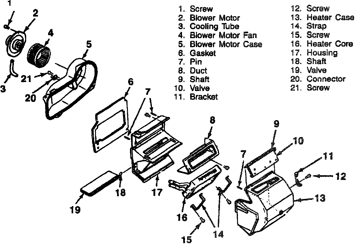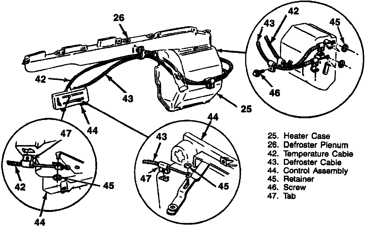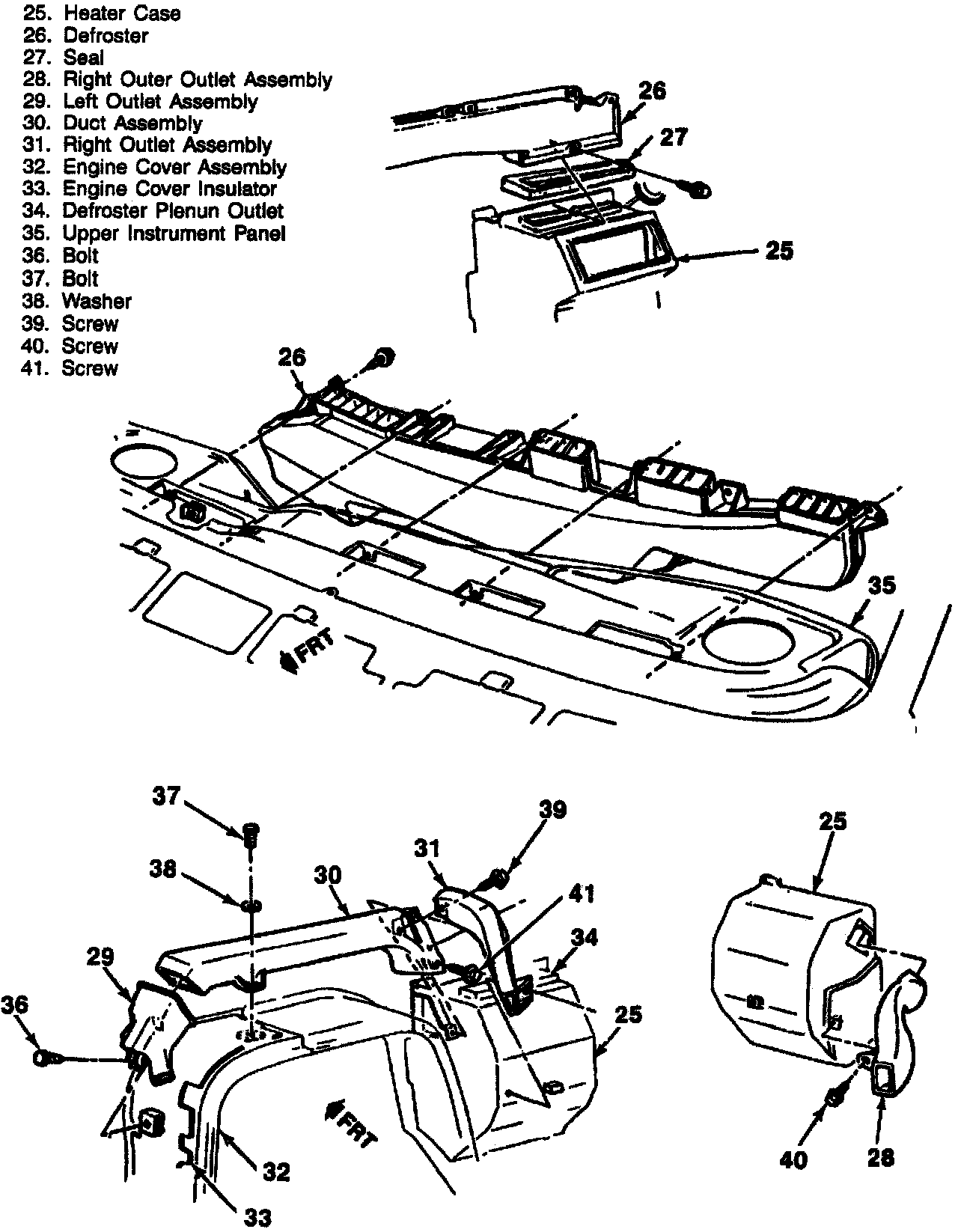 8. Defroster duct (26) to distributor case (25) attaching screws.