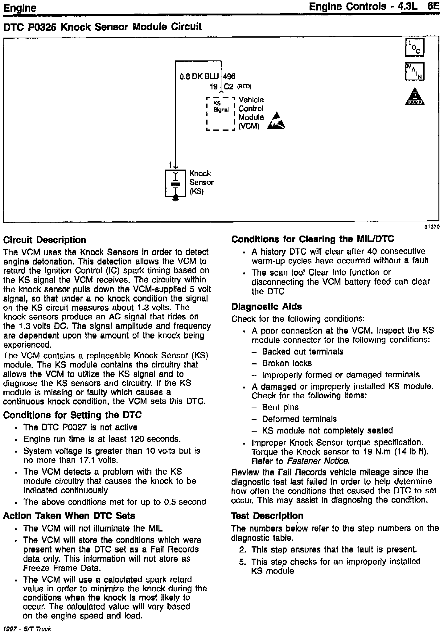 This bulletin is being issued to add Diagnostic Trouble Code P0325 which was missing from the 1997 S/T Truck Service Manual, Book 2 of 2.