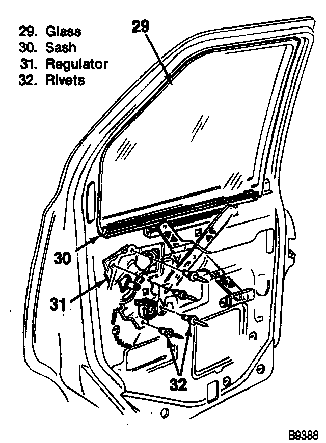 4. Peel the water deflector away from the door, using a soft-faced scraper if necessary, to separate the deflector from the door. Roll the window up, and apply cloth backed body tape from the window over the top of the door to the other side of the window to hold the glass in position when the regulator is removed.
