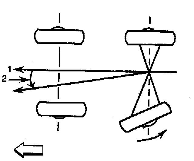 The thrust angle should be geometrically aligned with the centerline (1) of the vehicle body.
