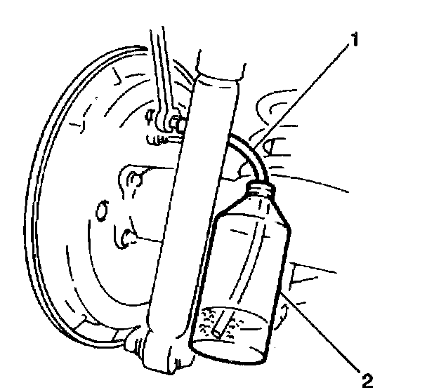 6. Attach a clear plastic or vinyl tube (1) to the bleeder plug. Submerge the other end of the tube in a clear container (2) partially filled with brake fluid.