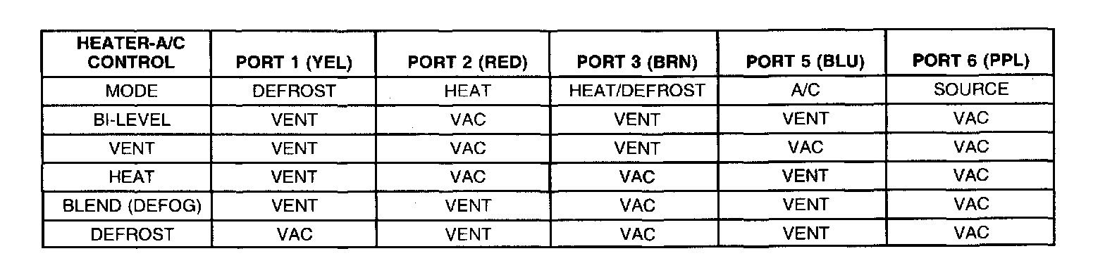 These ports in turn interface with a 6 port/6 conductor vacuum harness. It connects the control head to the vacuum source and the HVAC module. The vacuum is switched according to the following logic table.