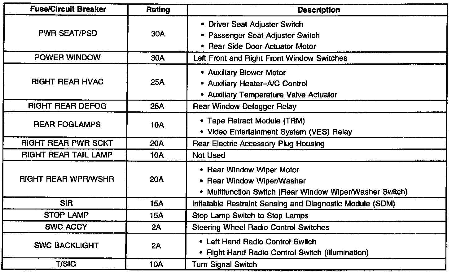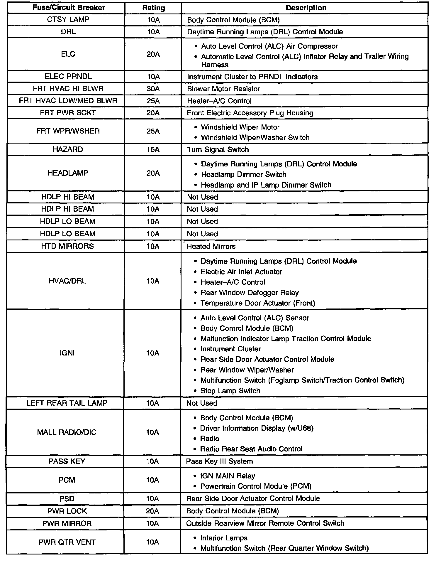 Fuse Block Application Table (Part 3 Of 3):