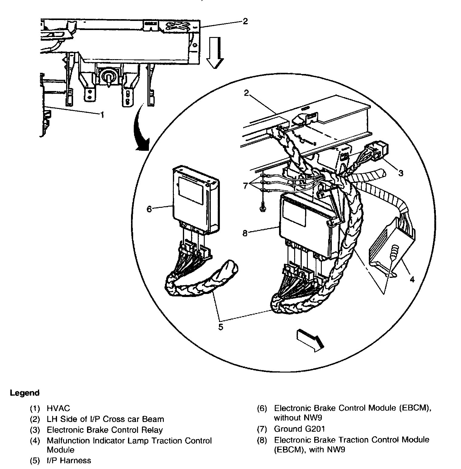 Electronic Brake Control Module/Electronic Brake Traction Control Module (EBCM/EBTCM): Left side of the IP, above the parking cable bracket