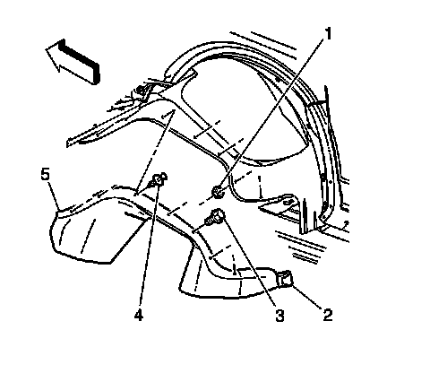 2. Remove the bolt (3) retaining the splash shield (5) to the wheelhouse.