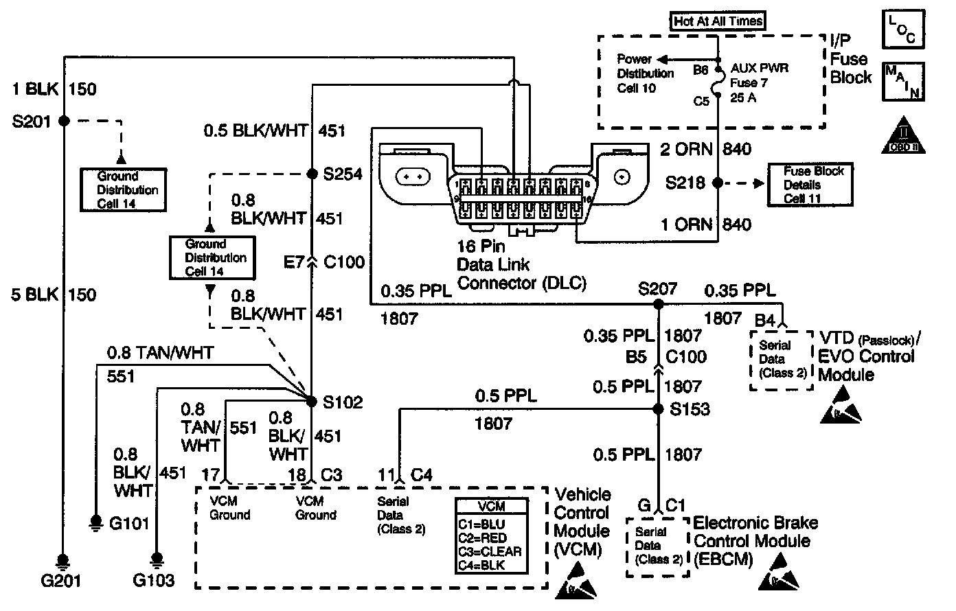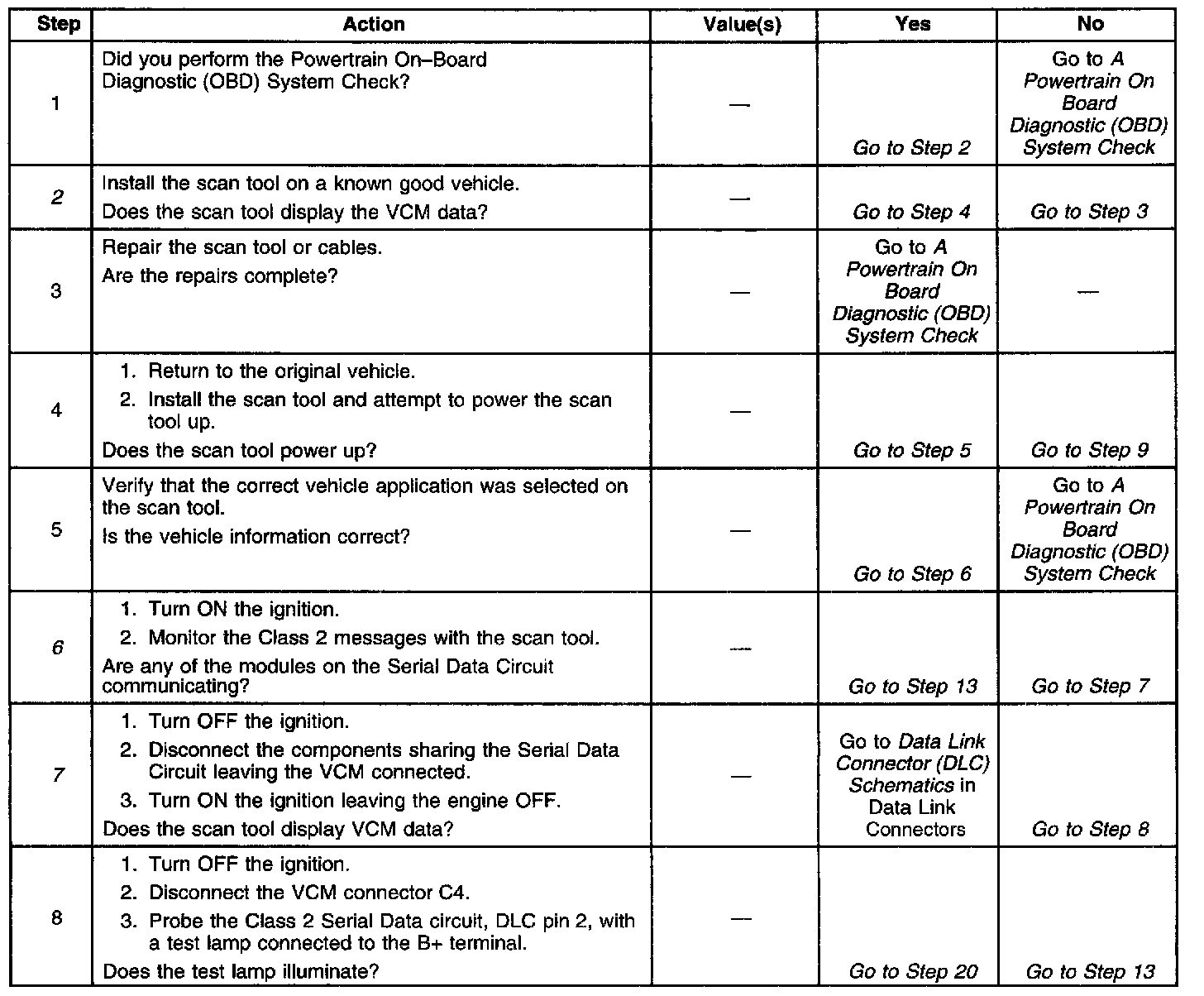 The Class 2 Serial Data circuit to the DLC allows bi-directional communication between the Vehicle Control Module (VCM) and the scan tool. This is accomplished through pin 2 of the DLC. If communication between the scan tool and the VCM cannot be established, the procedure in the DLC Diagnosis table should be used to diagnose the condition.