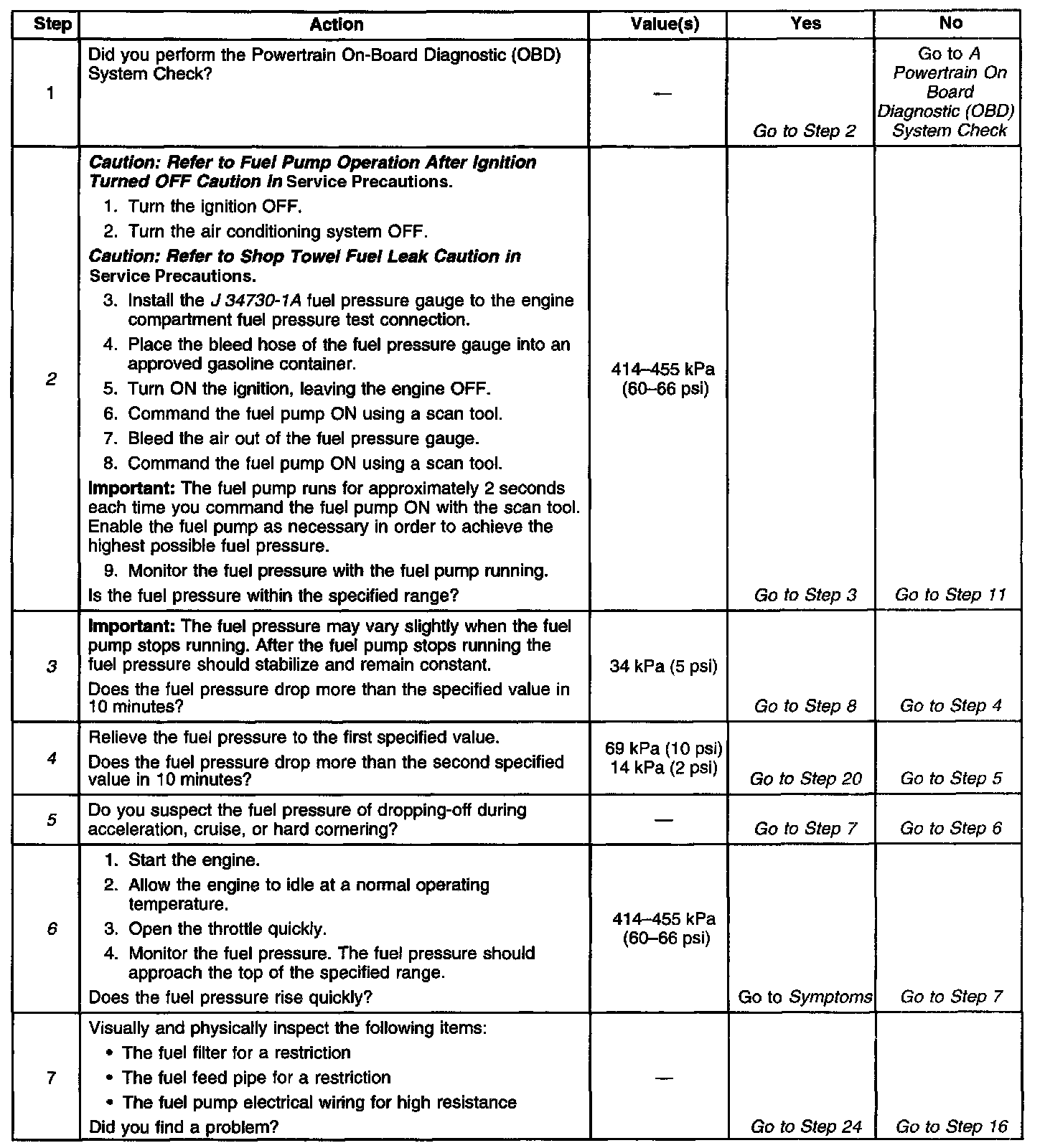 4. A fuel system that drops more than 14 kPa (2 psi) in 10 minutes after being relieved to 69 kPa (10 psi) indicates a leaking fuel pump check valve.