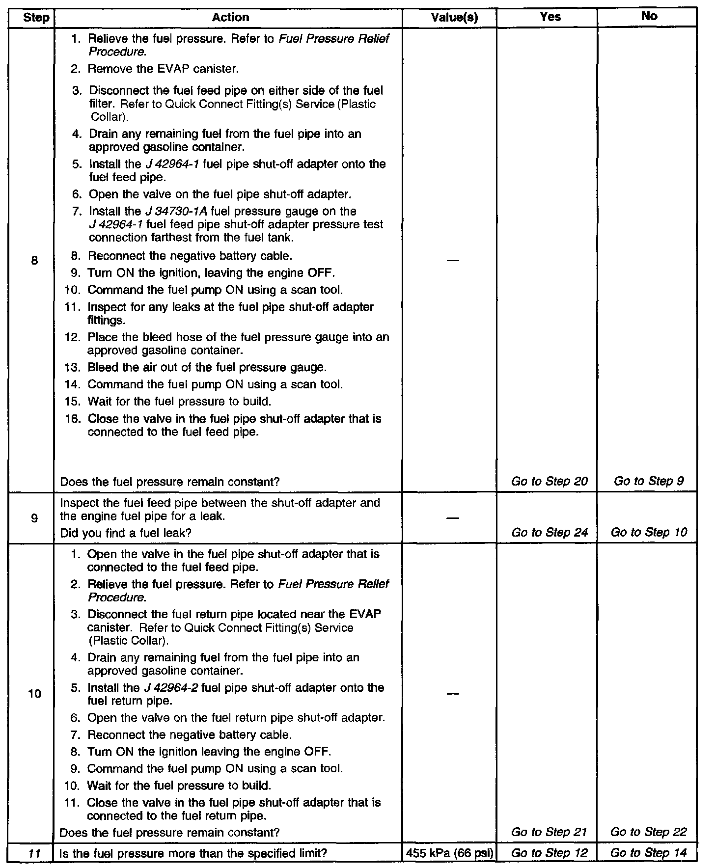 15. Restricting the fuel return pipe with the J 42964-2 fuel pipe shut-off adapter causes the fuel pressure to rise to more than the regulated fuel pressure. Using a scan tool to pressurize the fuel system, the fuel pressure should rise to more than 455 kPa (66 psi) as the valve on the fuel pipe shut-off adapter connected to the fuel return pipe becomes partially closed.